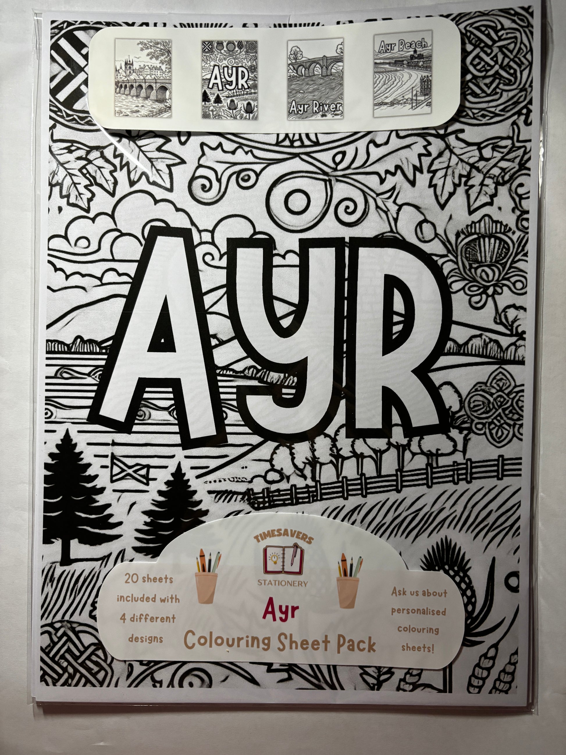 - Pack Details: 4 unique Ayr-themed designs, with 5 copies of each design, making a total of 20 high-quality A4 sheets
