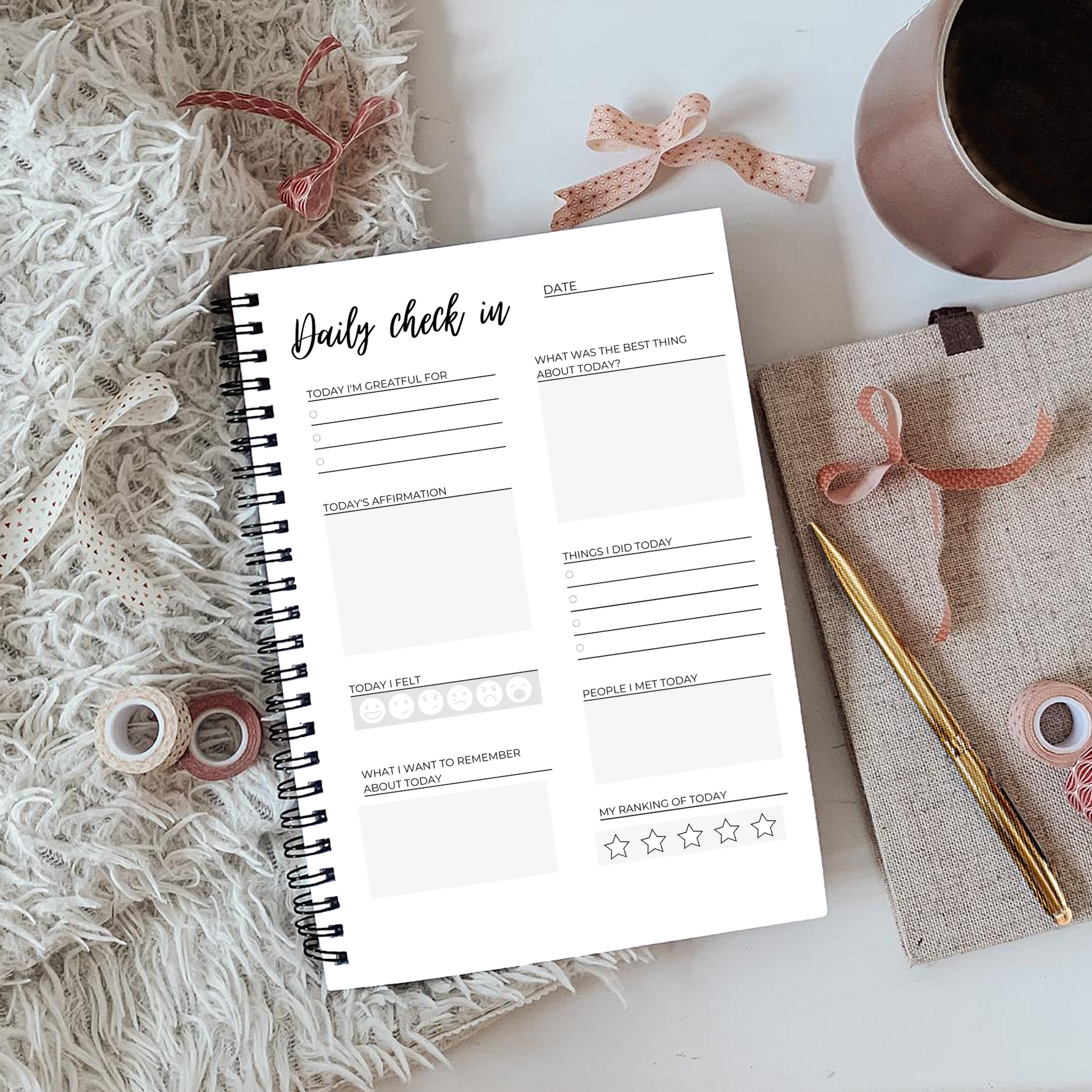 - Page 1: Daily check-in page with sections for gratitude, daily reflection, mood, and a star rating of your day ⭐