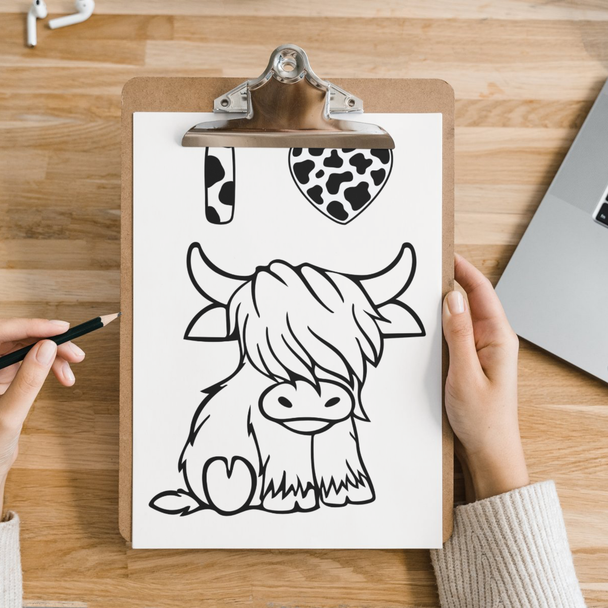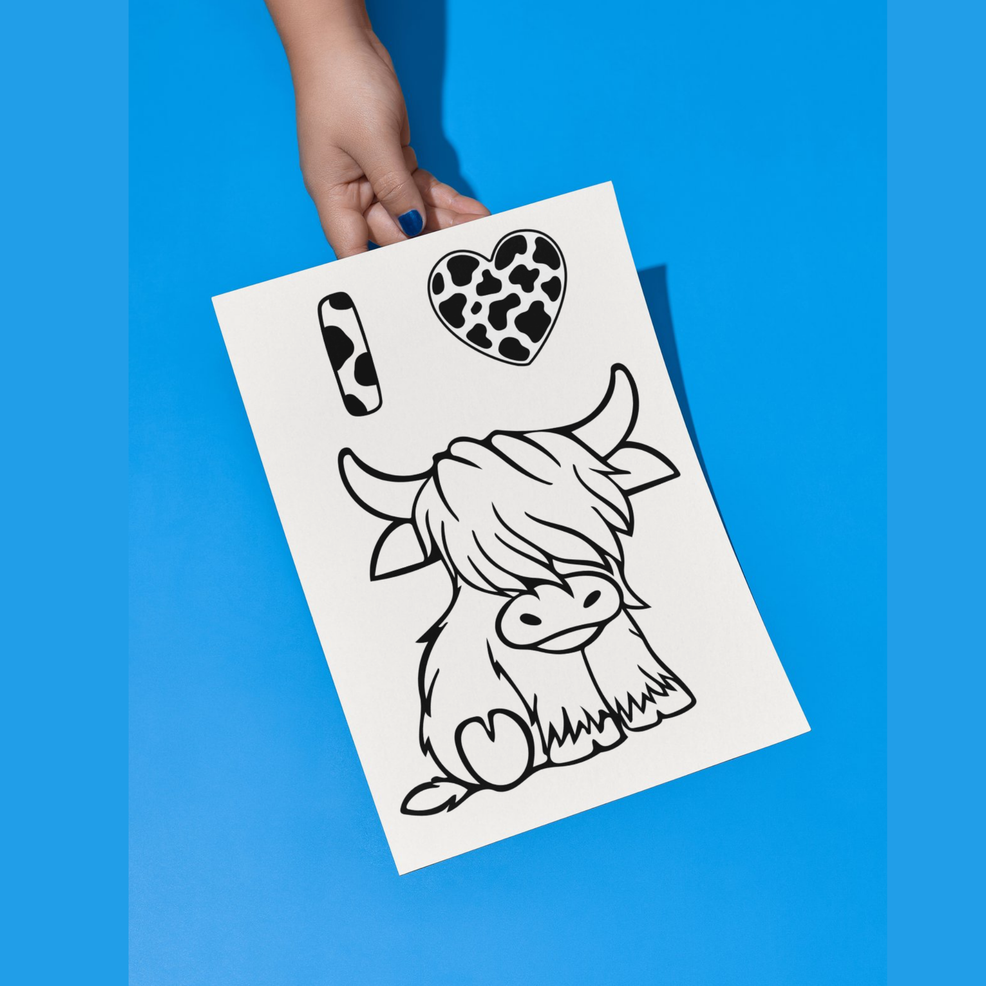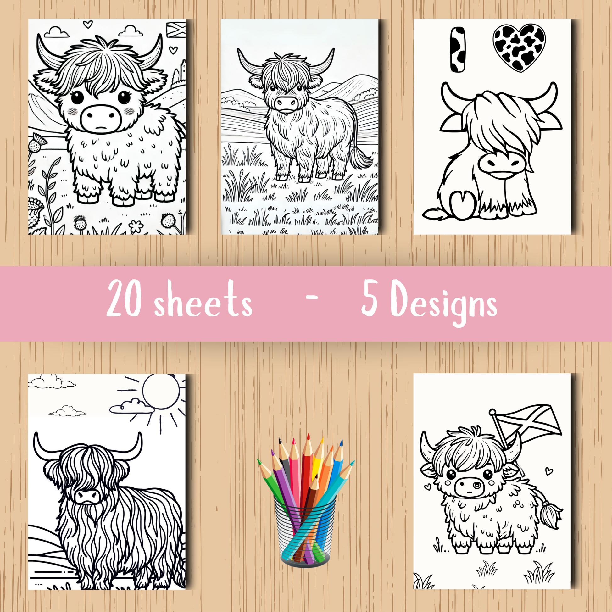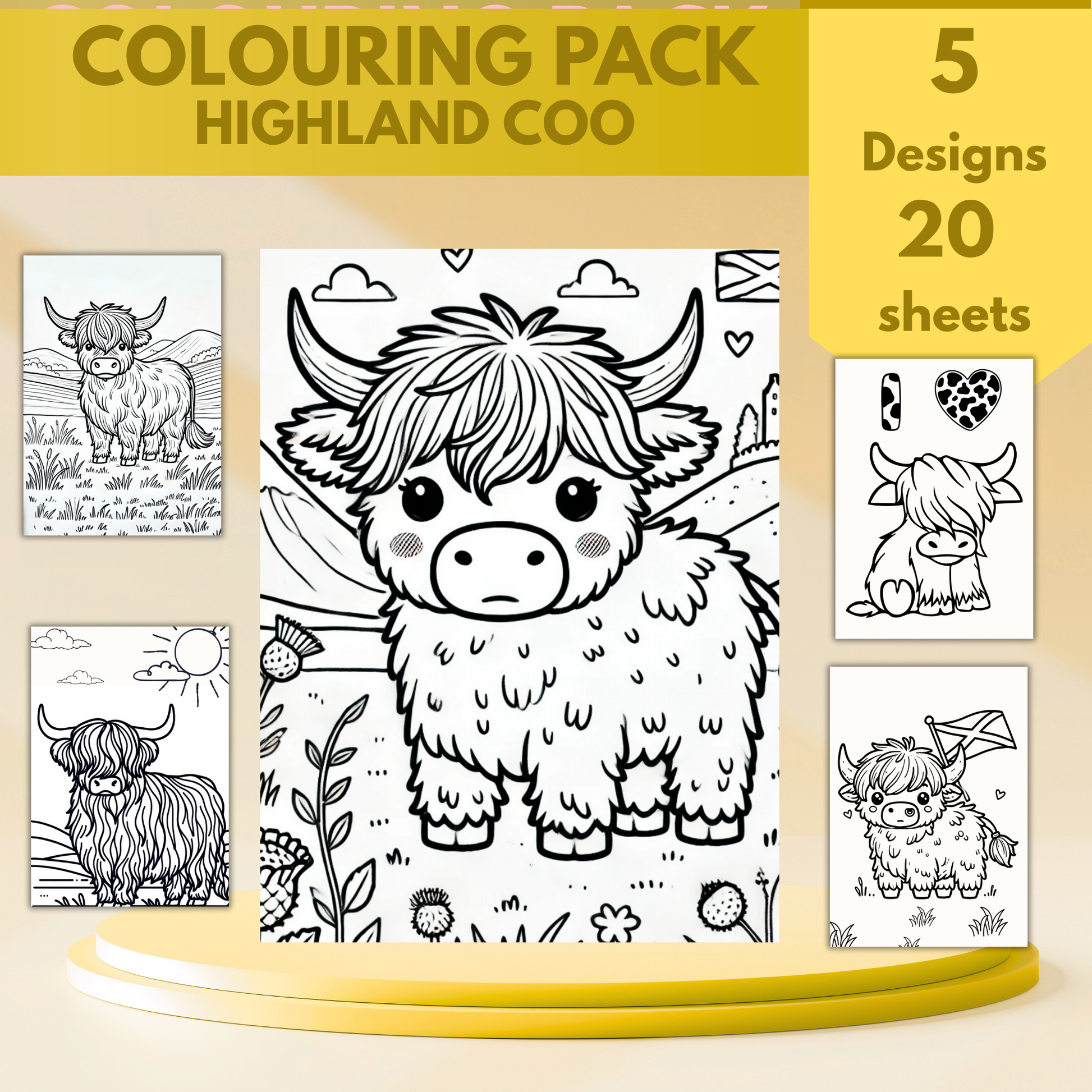 - Pack Details: 5 unique Highland Coo-themed designs, with 4 copies of each design, making a total of 20 high-quality A4 sheets