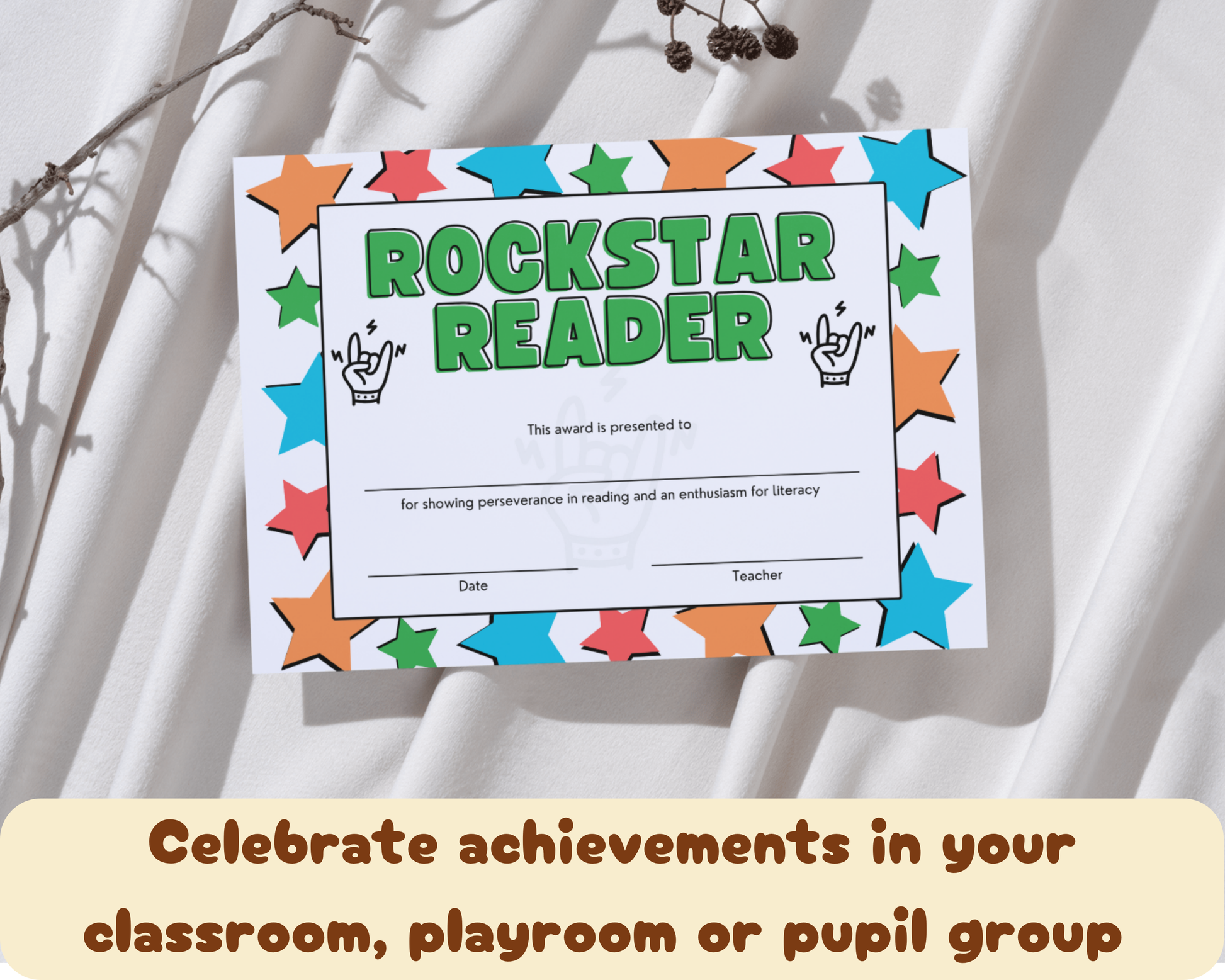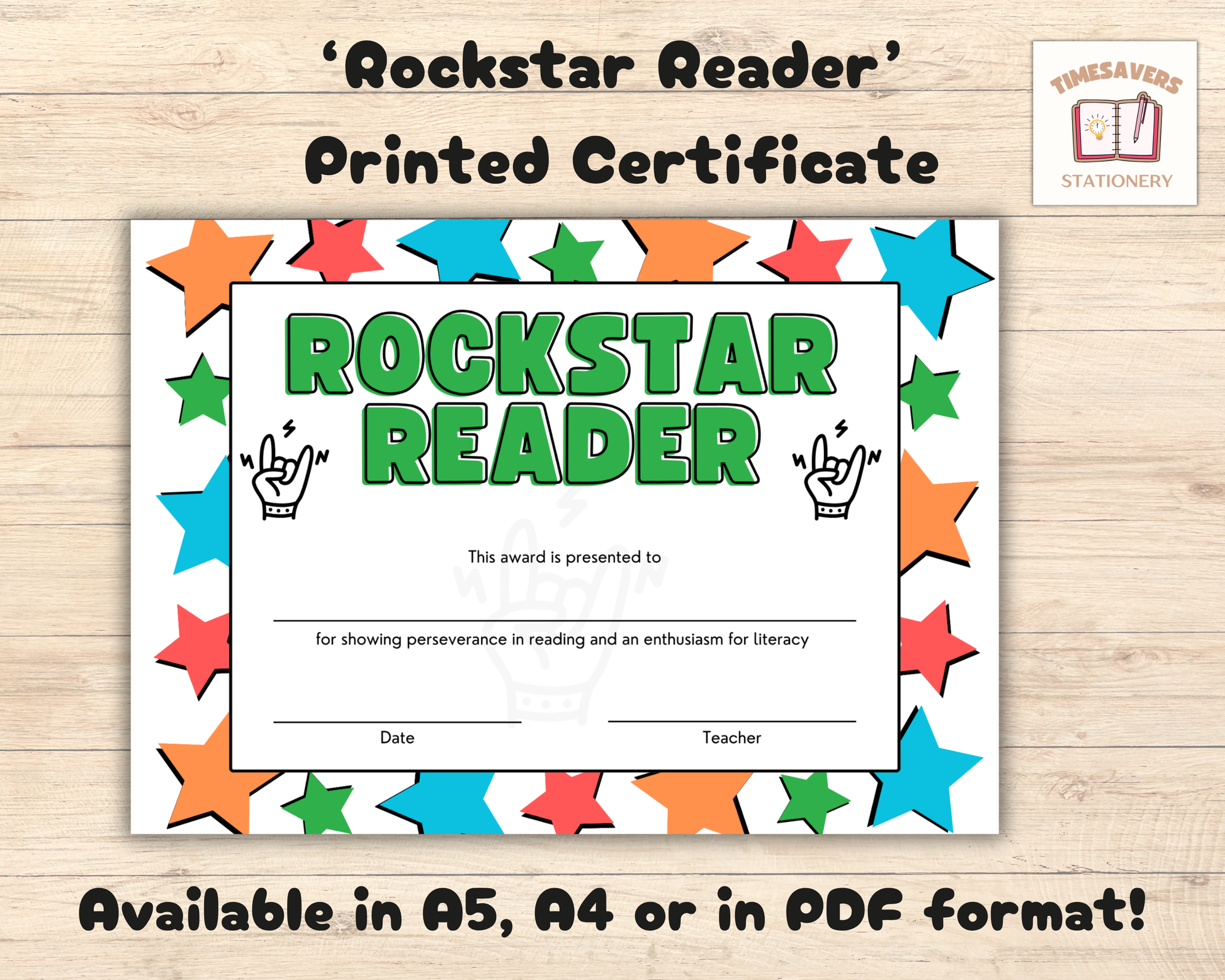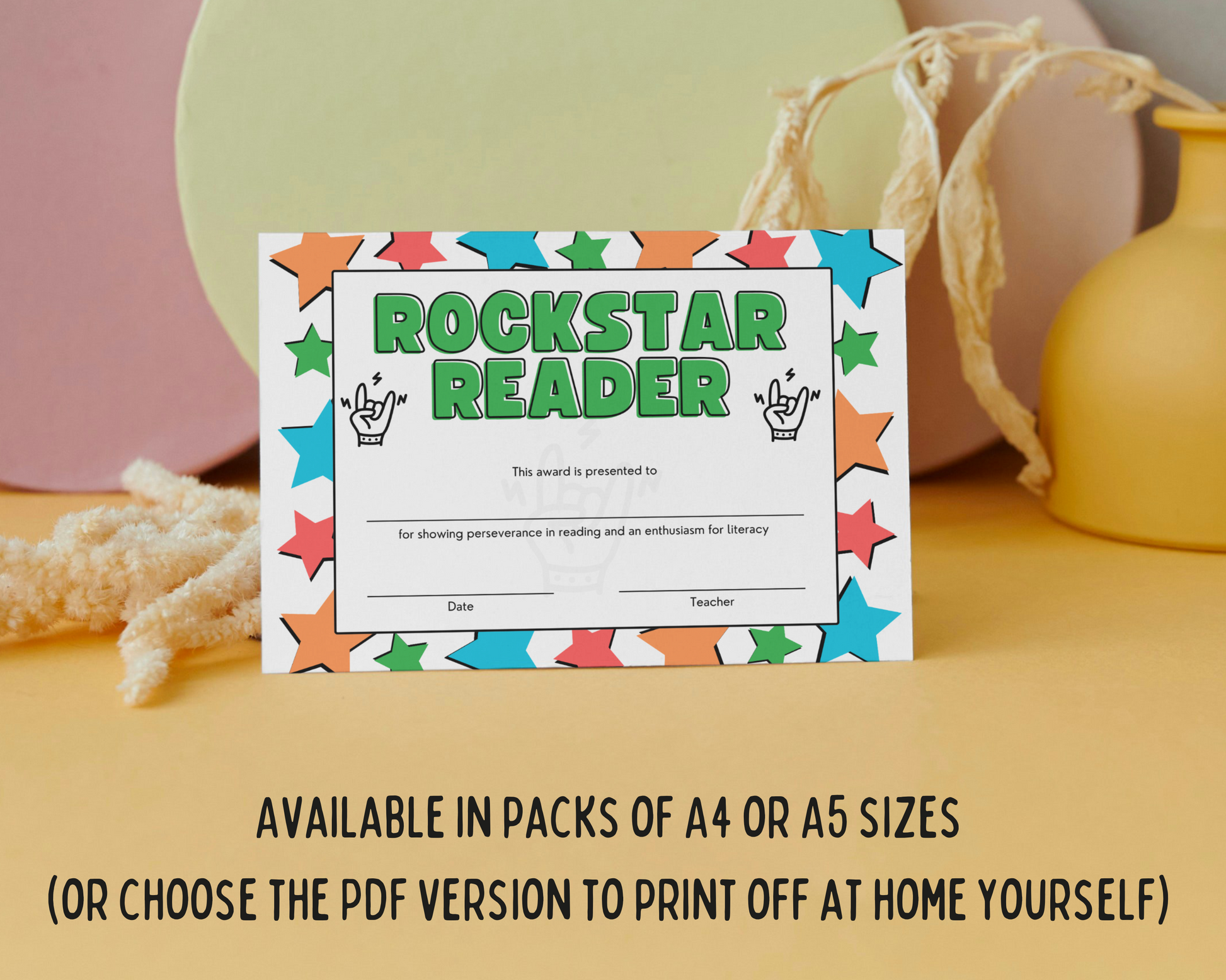 Printed Rockstar Reader Award Pupil Certificate, A4 or A5 certificates, classroom management resources, teacher class resources, home school