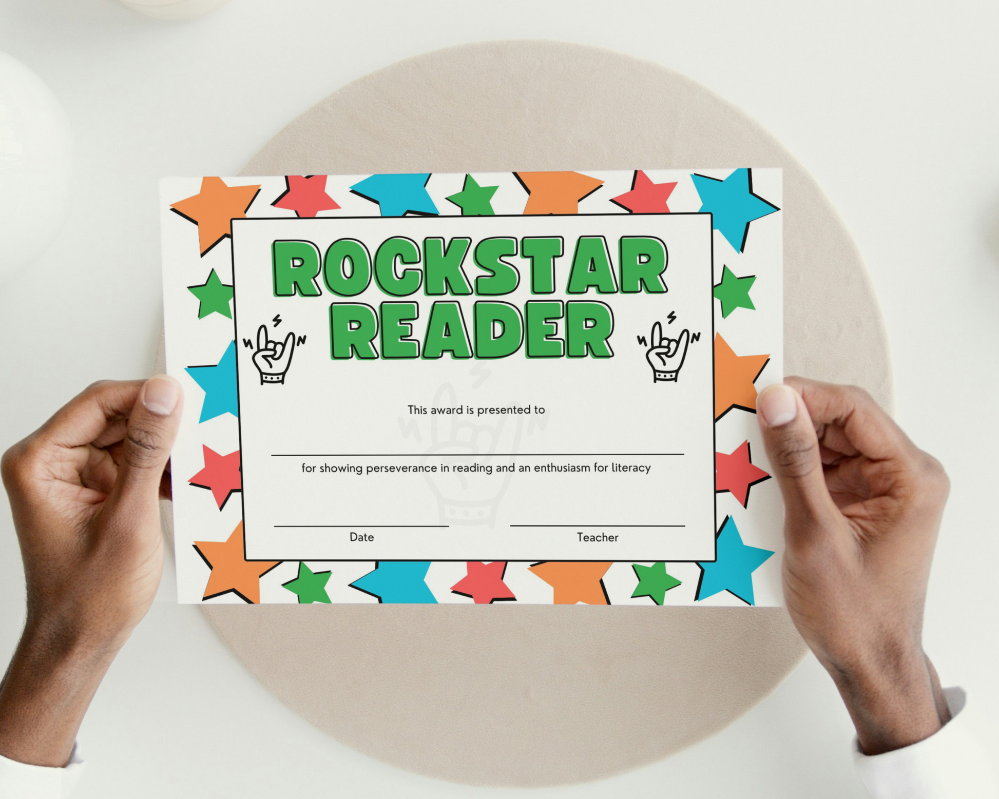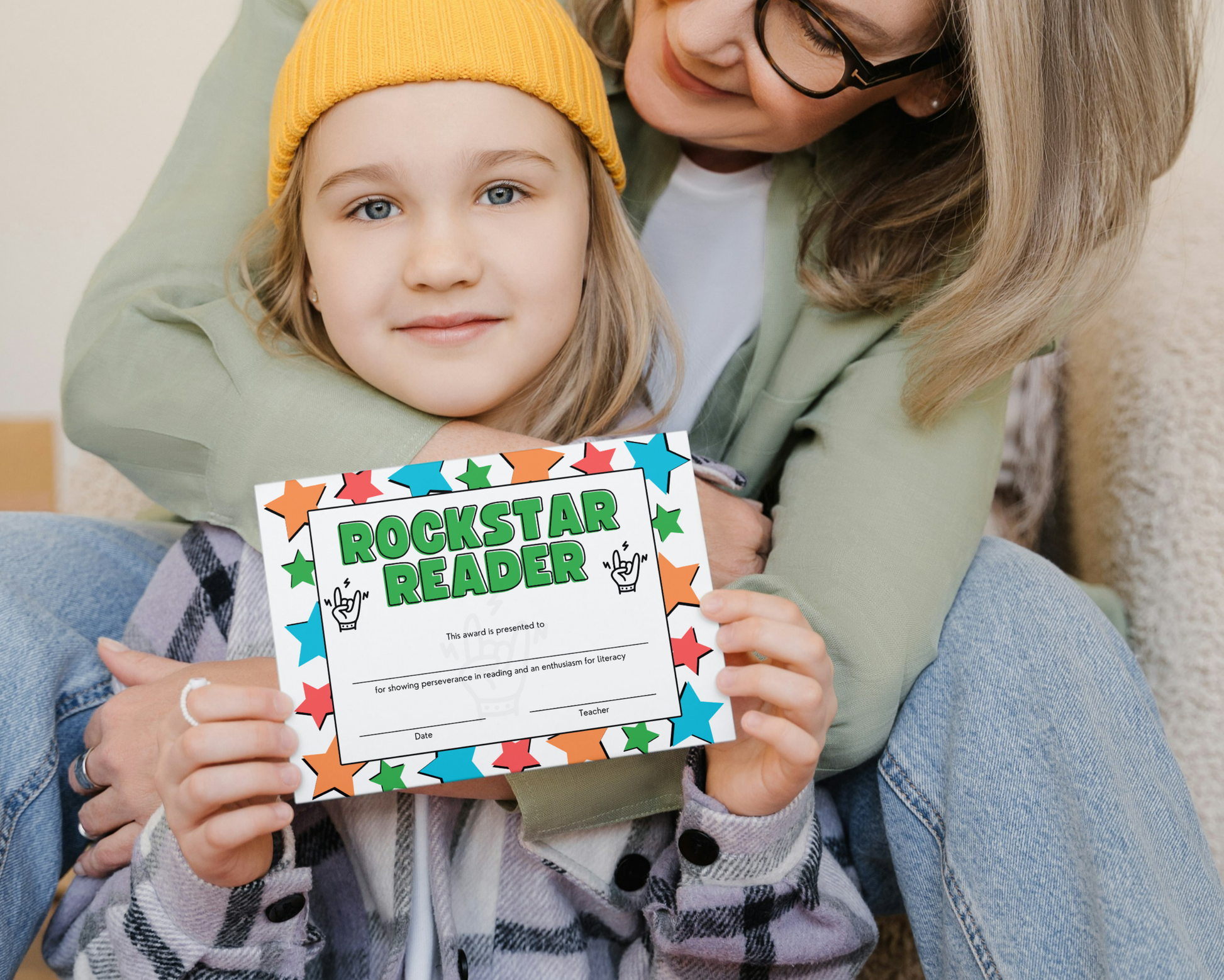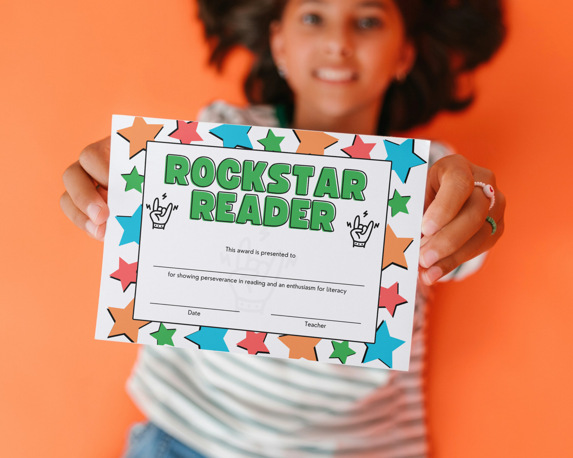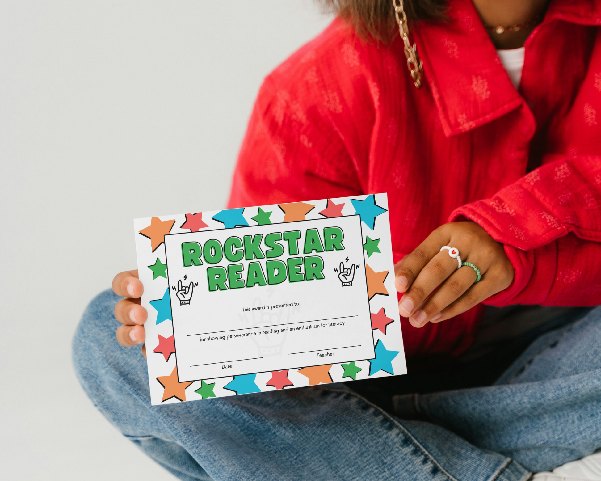 Printed Rockstar Reader Award Pupil Certificate, A4 or A5 certificates, classroom management resources, teacher class resources, home school