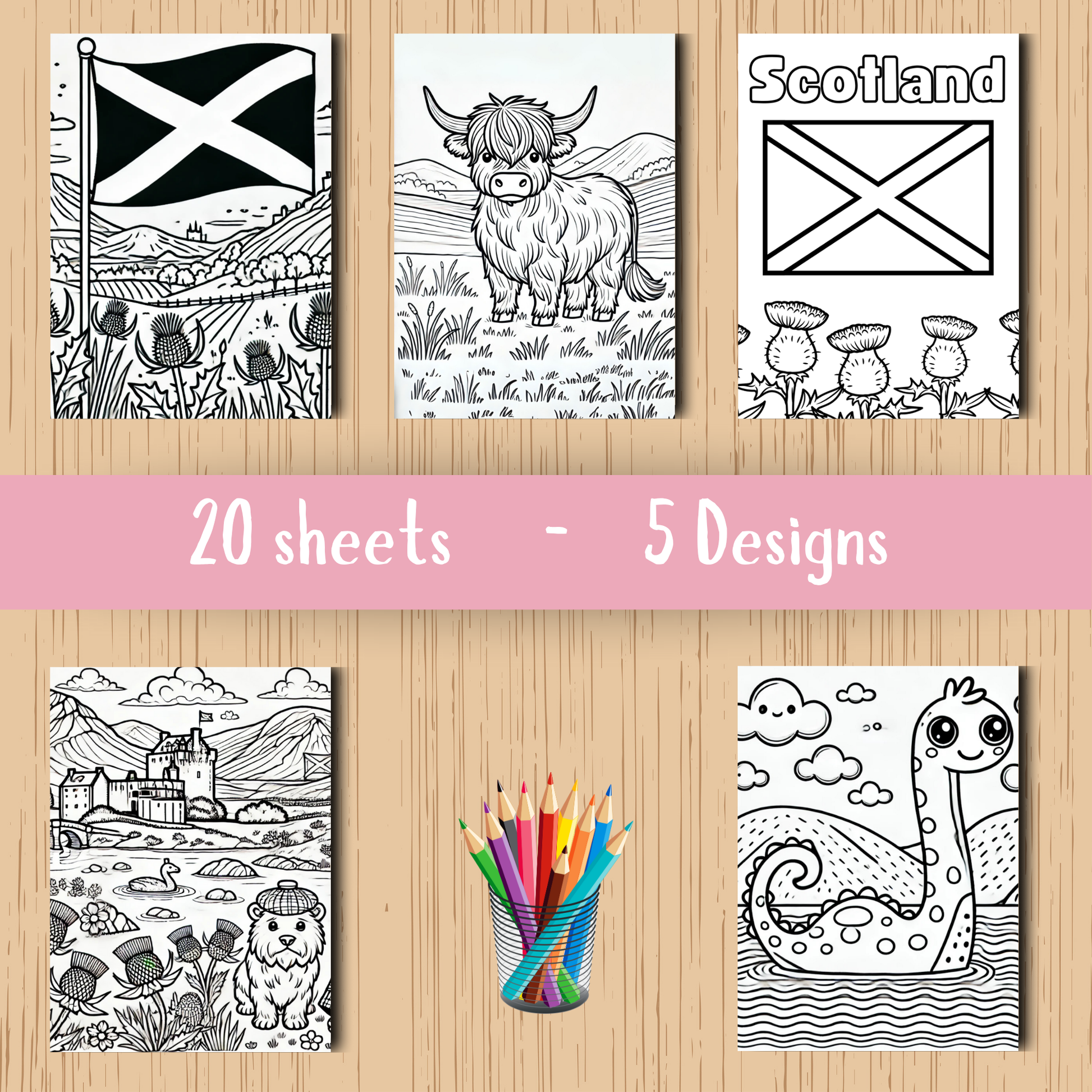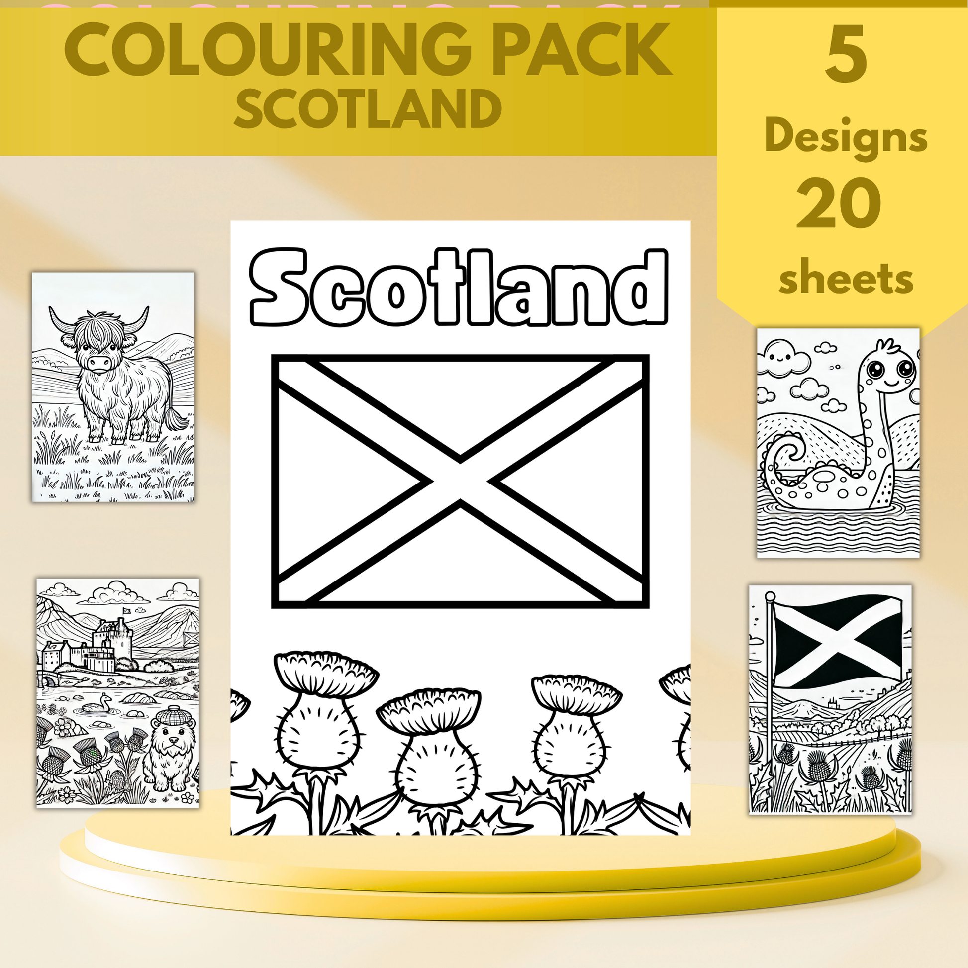 - Pack Details: 5 unique Scotland-themed designs, with 4 copies of each design, making a total of 20 high-quality A4 sheets